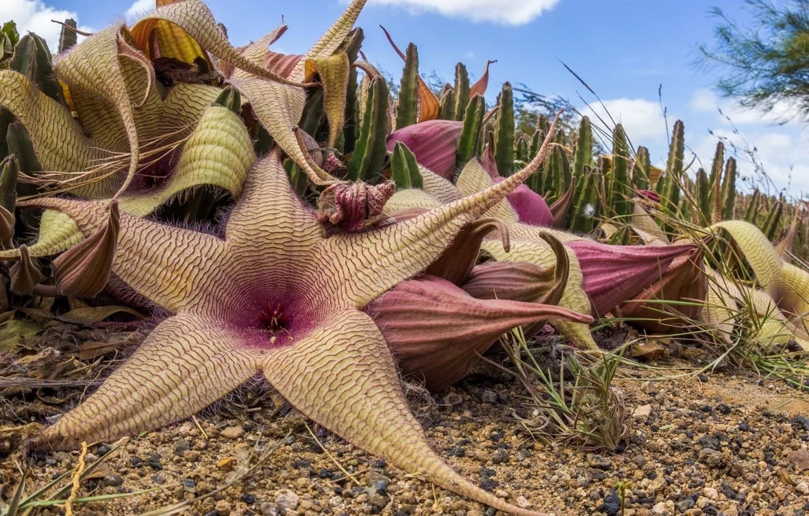 Стапелия (Stapelia) родом из Африки, и её место жизни не отличается от дикой Австралии: и там, и здесь царствует экзотическая флора и фауна. Эта потрясающая растительность привлекает внимание благодаря своим необычным цветкам, которые напоминают морскую звезду не только своей формой, но и цветовой гаммой. Нежно-розовый или пурпурный в пятнах — разнообразие оттенков зависит от солнечного света, который получает стапелия. Цветы распускаются с эффектным хлопком, медленно открывая свои лепестки.