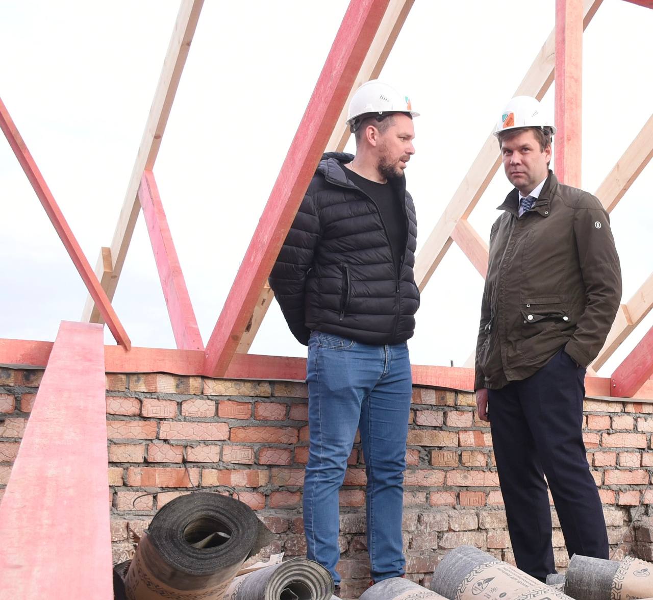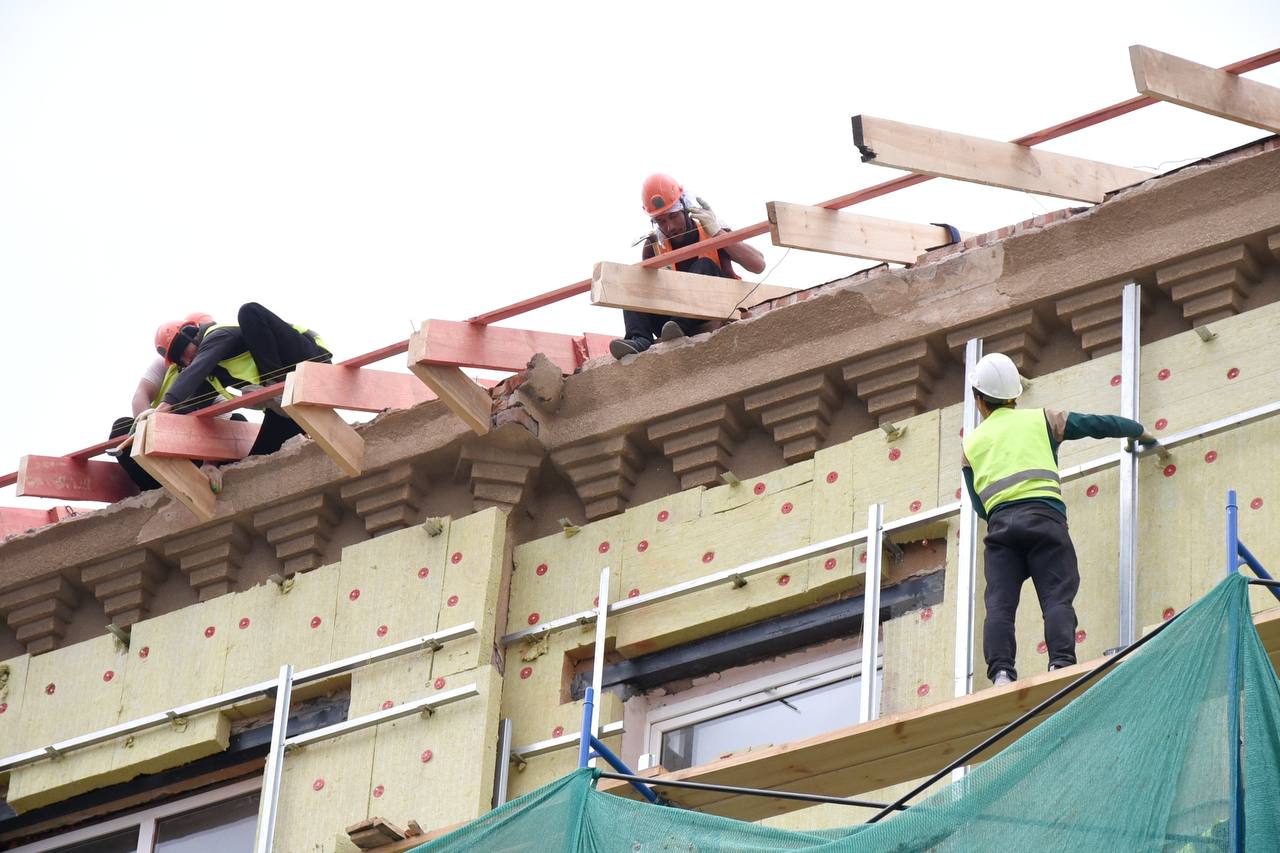 Рабочие уже демонтировали старую крышу и начали собирать конструктив новой, делают усиление оконных проёмов и выполняют комплекс противопожарных мероприятий. Одновременно с этим проводятся фасадные работы - утепление, облицовка, монтируется электрика для подсветки.
