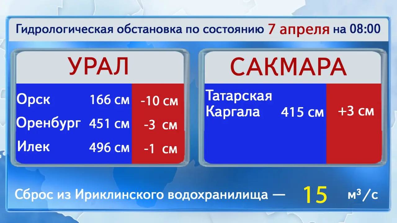 По данным на 7 апреля, на большинстве рек области наблюдается понижение уровней воды на 1–86 см за сутки. Лишь местами зафиксирован подъём на 2–8 см. Максимальный рост отмечен на реке Урал у поста Берёзовка — 20 см.