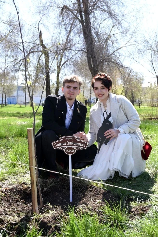 Рядом теперь растет дерево молодоженов Зайцевых. Глеб и Отрада познакомились в Оренбурге на фотосессии. Глеб проводил видео и фотосъемку, а Отрада была моделью. Между ними возникла симпатия, которая переросла в настоящую любовь. Посадка дерева стала для пары символическим началом семейной жизни.