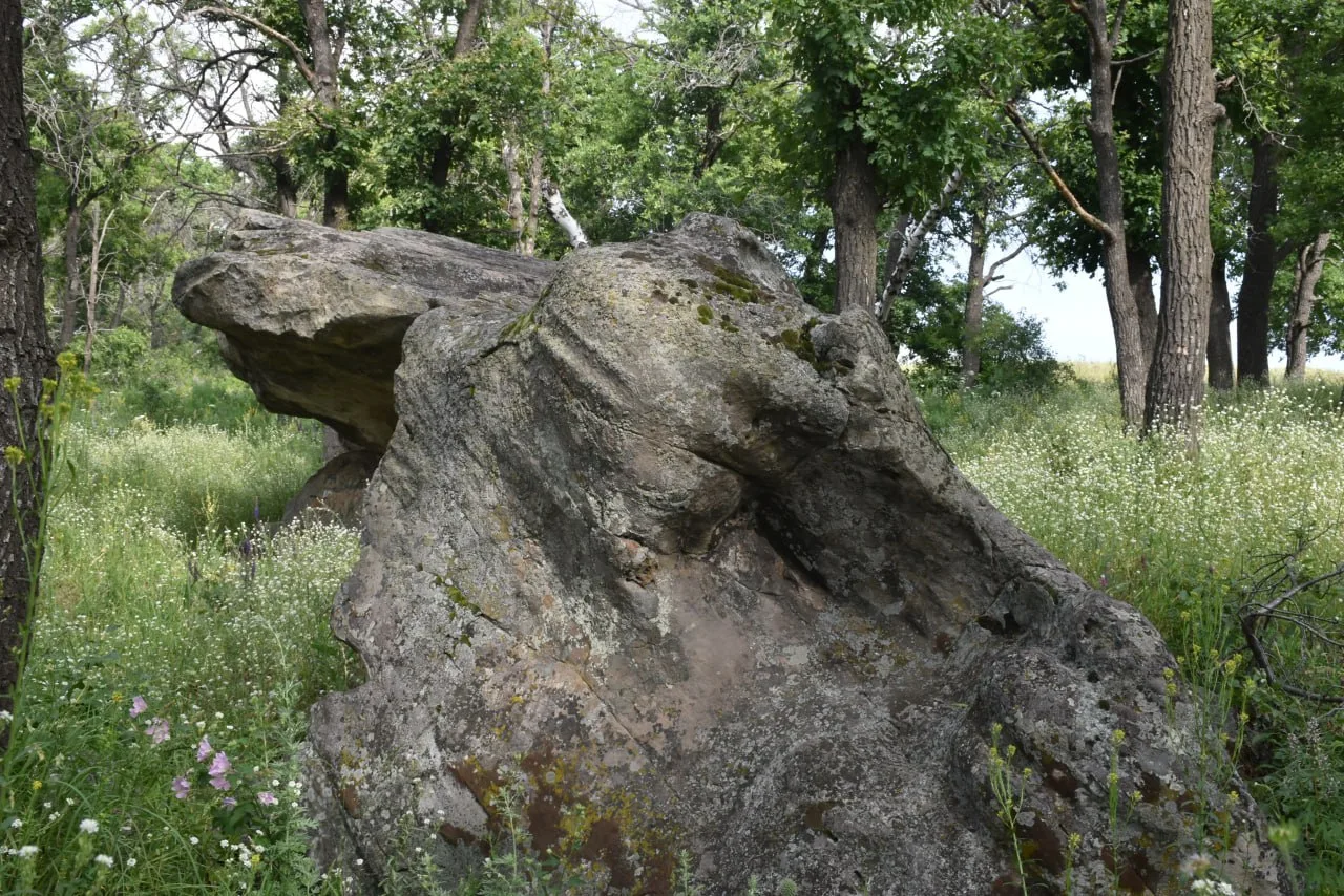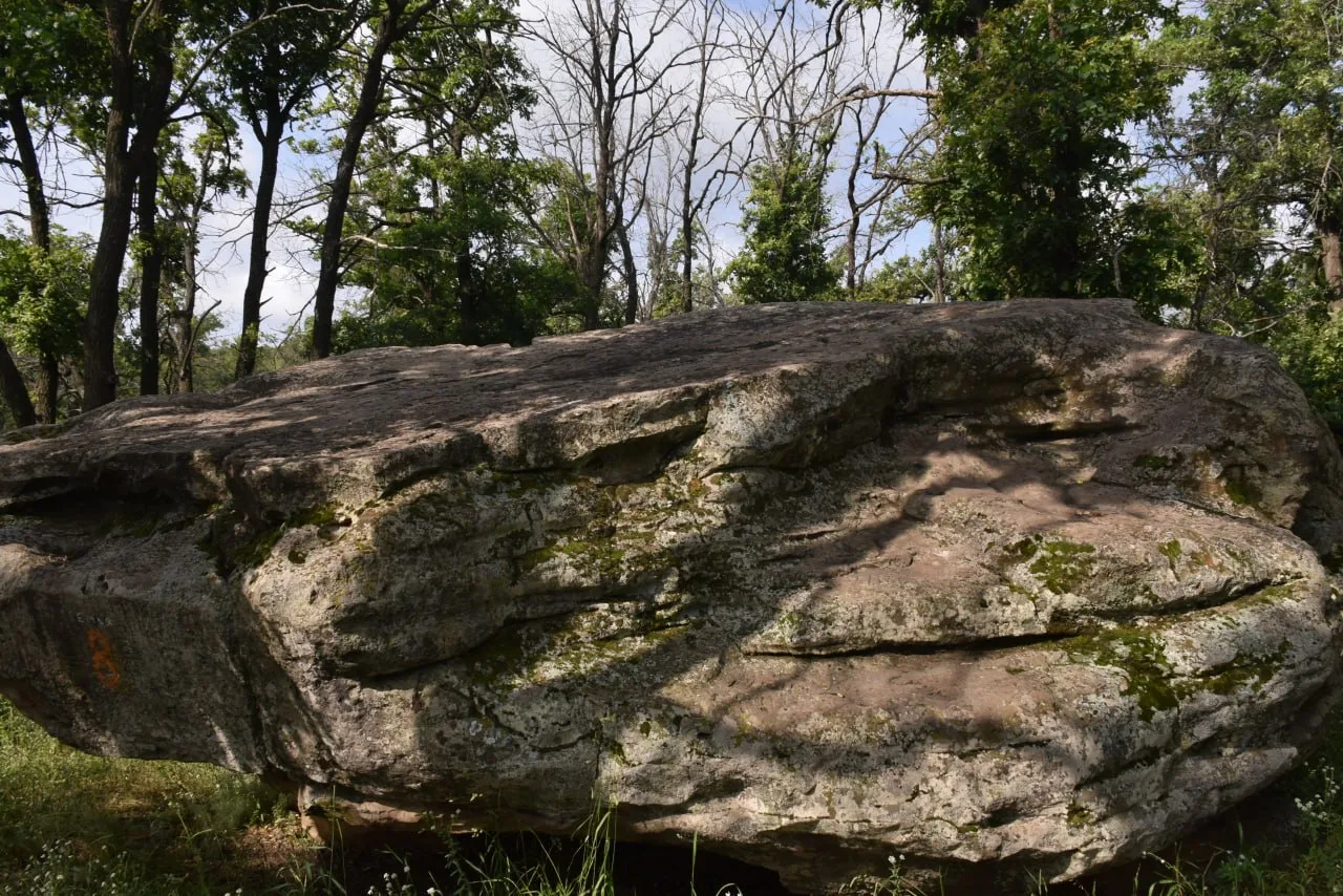 Во-вторых, здесь есть настоящий великан - глыба размером 8 на 5 метров. Она лежит на двух других камнях, образуя арку. Рядом видны старые ямы: когда-то здесь добывали песок и сами глыбы для строительных нужд.