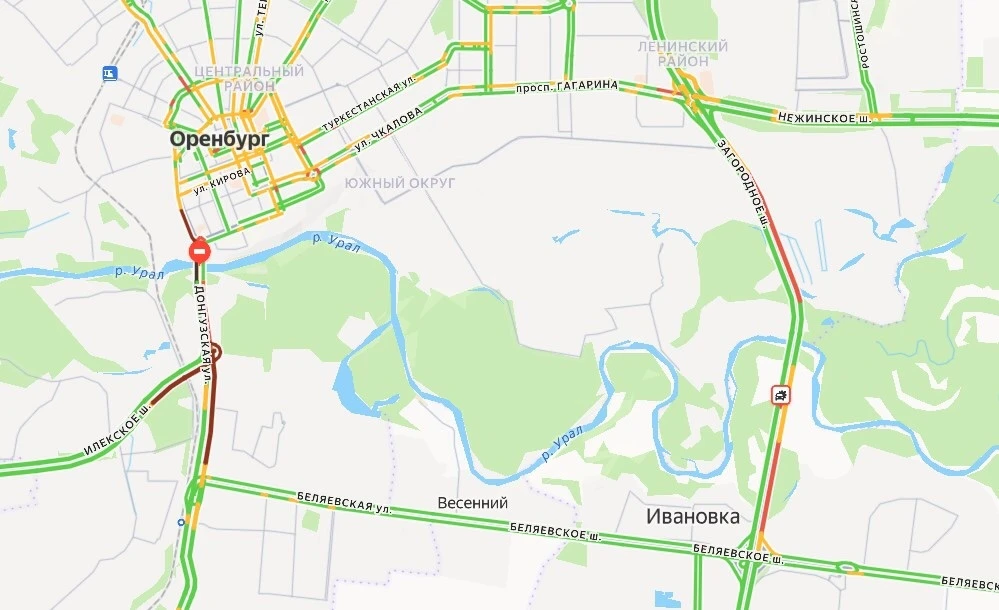 Затруднено движение сегодня и по Загородному шоссе на участке между Беляевским и Нежинским шоссе. При этом по мосту через Урал на нем проезд свободный.